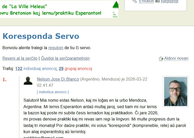 Edukado.net 基金会网站设有世界语通信服务栏目,目前中国大陆境内可以访问。打开它的通信服务栏目,就可以根据对方所在国家、语言水平、年龄等搜索愿意通信的外国世界语者。